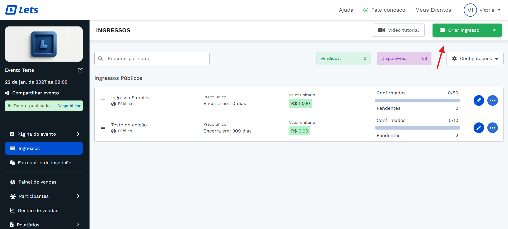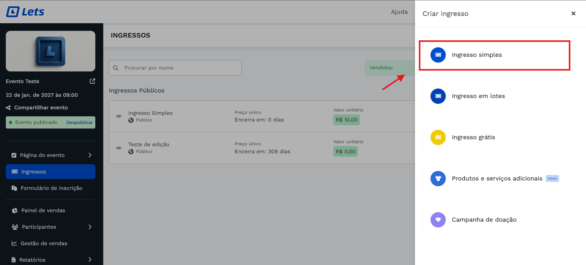 Criar seus ingressos no Lets é simples e rápido. Confira o passo a passo no vídeo abaixo ou siga as instruções: