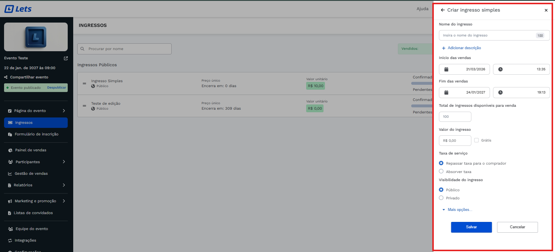 Nome e Período: Defina o nome do ingresso e os horários de início e término das vendas.