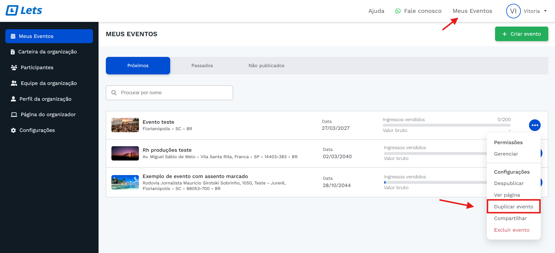 Como duplicar: Em "Meus Eventos", clique nos três pontos à direita do evento desejado, selecione Duplicar, insira o novo nome e data, e confirme em Duplicar Evento.