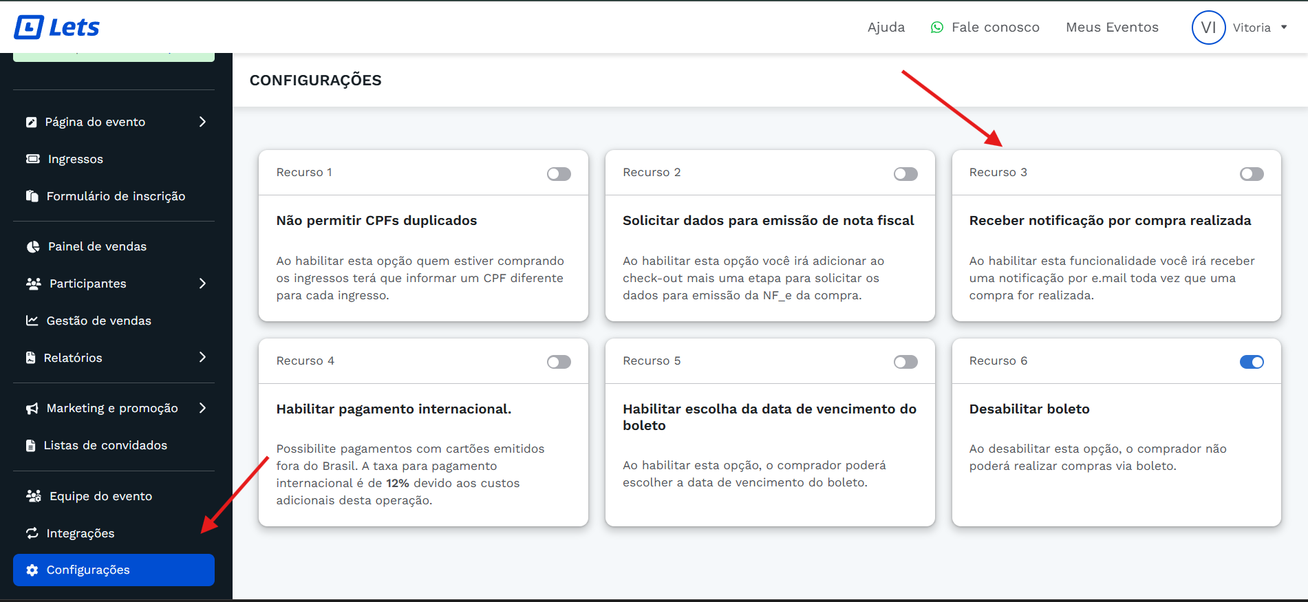 Para receber uma notificação no seu e-mail sempre que houver uma nova compra no seu evento, é bem simples, basta acessar as configurações do evento e habilitar o recurso numero 3.