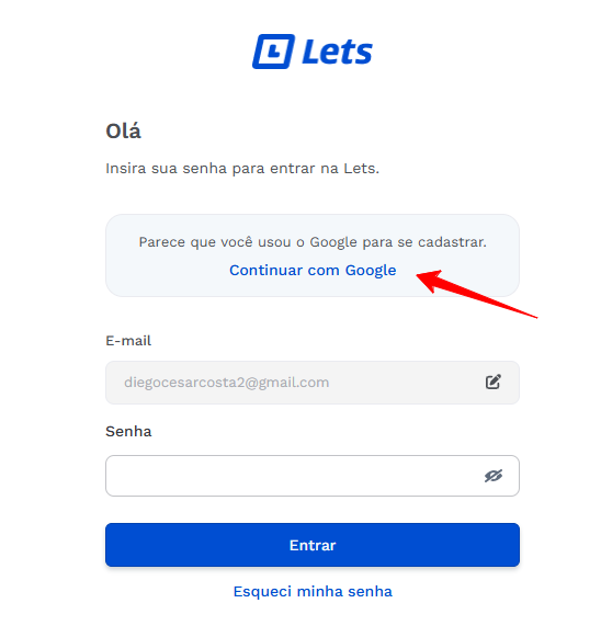 Caso tente acessar digitando seu e-mail e seu cadastro tenha sido criado com Google ou Facebook, você verá um aviso na tela.