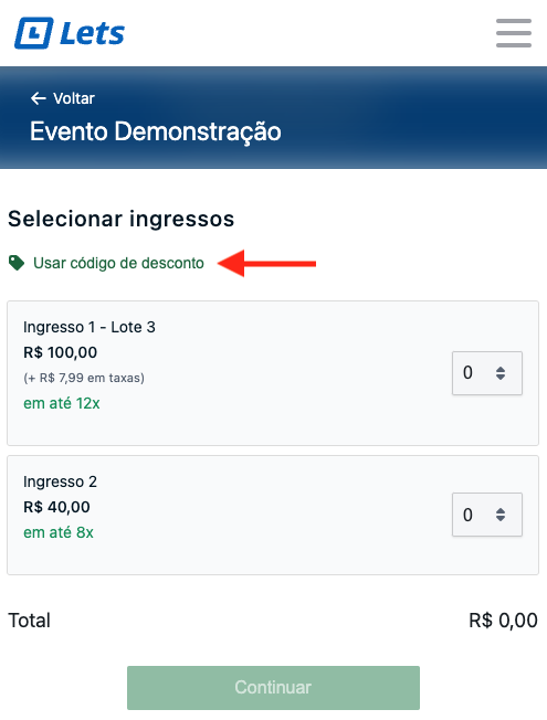Na tela de escolher os ingressos clique no botão usar código de desconto => insira o código de desconto e depois no botão aplicar => todos os ingressos que tem desconto irão mudar para o novo valor imediatamente.