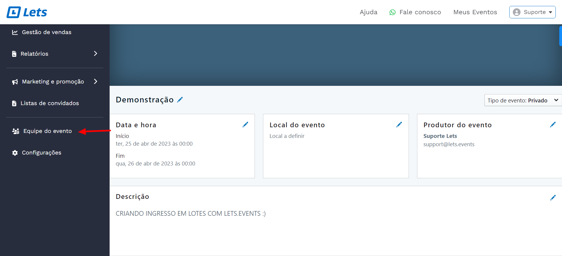 1 - Dentro da página de administração do evento, clique em equipe do evento no menu à esquerda de acordo com a imagem: