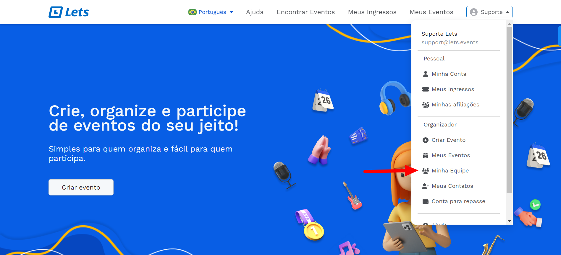 1 - Acesse seu perfil no canto direito superior e clique em Minha Equipe conforme a imagem: