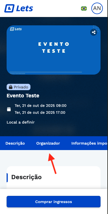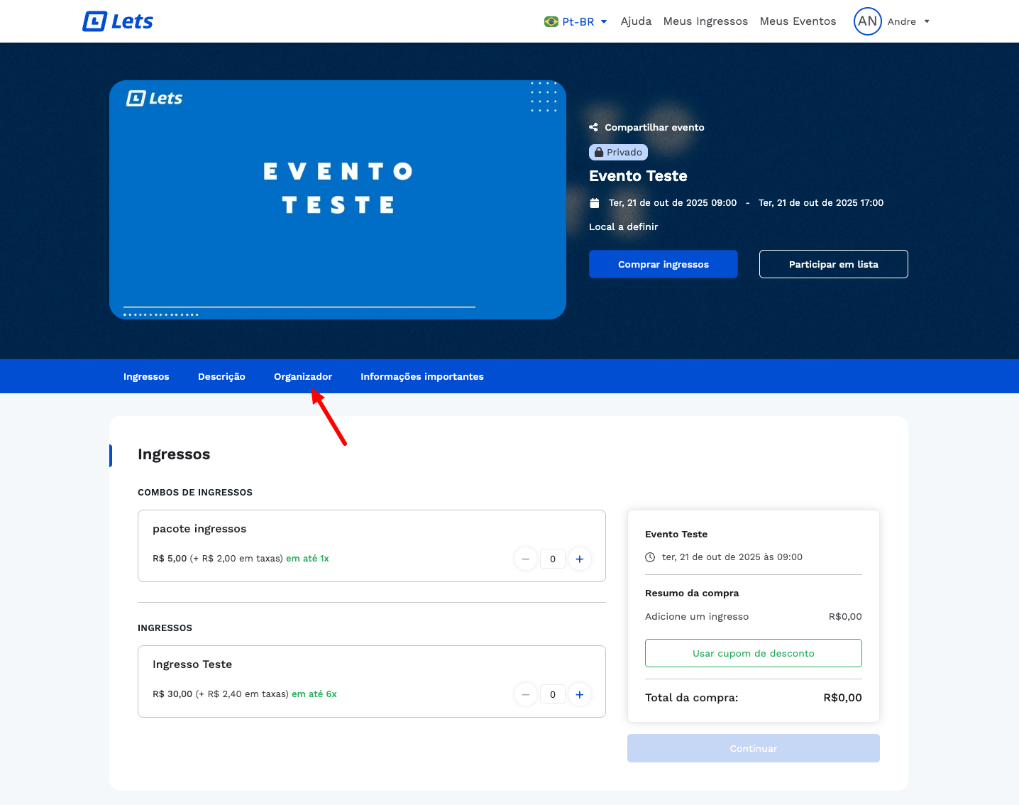 Acesse a página do evento e clique na aba organizador conforme a imagem abaixo: