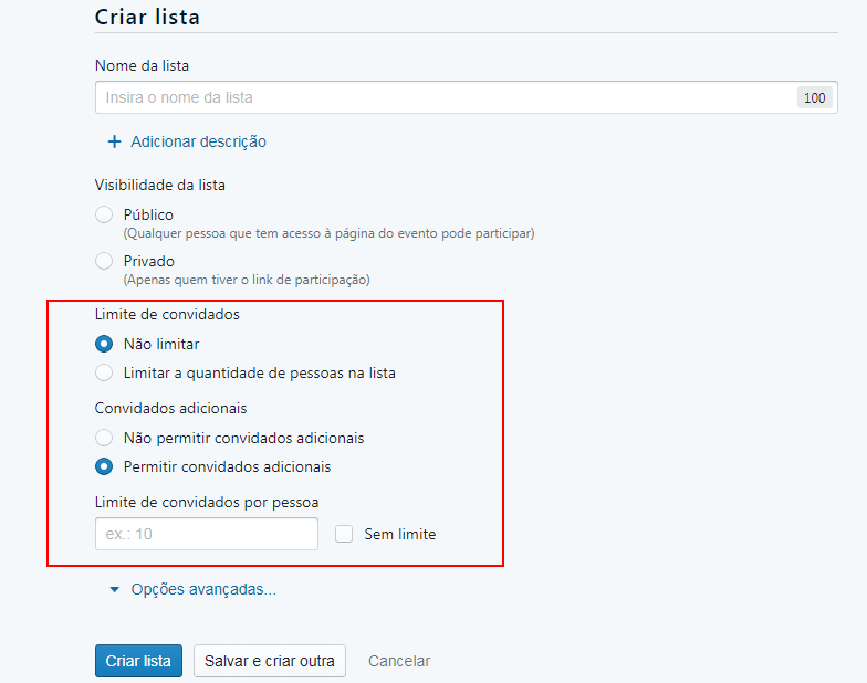 Caso não queira limitar a quantidade de convidados adicionais, marque a opção Sem limite.