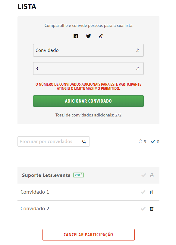 É possível autorizar e limitar o número de convidados adicionais que cada participante pode levar. Por exemplo: caso você crie uma lista de cortesias, você pode configurar para que o participante possa inserir no máximo 5 convidados adicionais.
