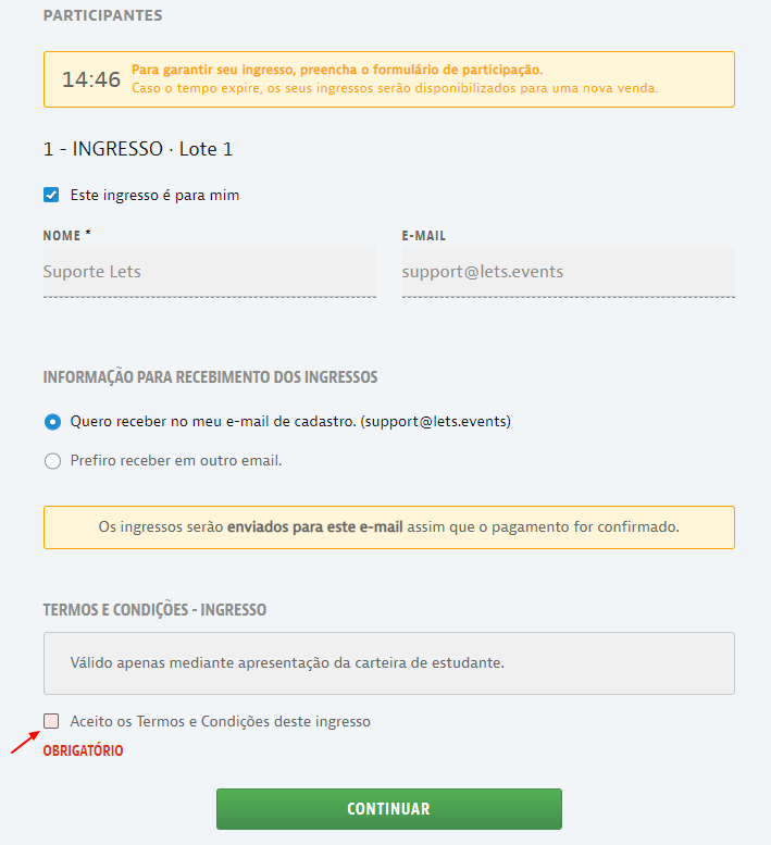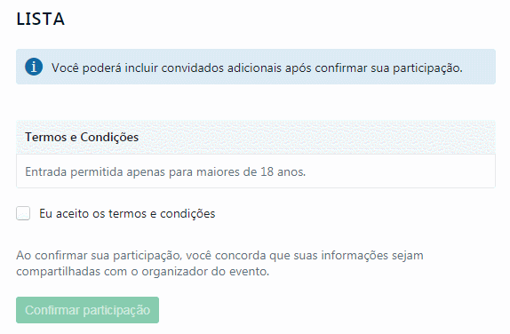 selecionar a opção "Eu aceito os termos e condições", concordando, assim, com as condições definidas pelo organizador do evento.